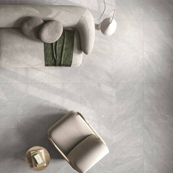 Het oppervlak van de Nesting-collectie van porcellanato vloer- en wandtegels is geïnspireerd op een primitieve Braziliaanse leisteen die door de zon is gebleekt van zijn oorspronkelijke zwart naar een meer vervaagd grijs.